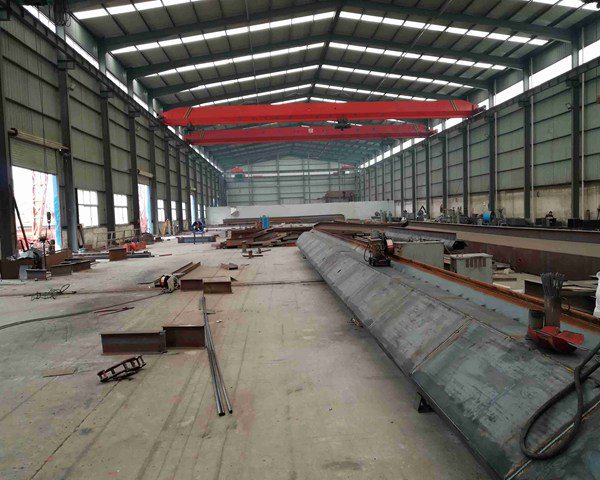 桥架是桥式起重机的基本构件,它由主梁、端梁、走台等部分组成。主梁跨架在跨间上空,有箱形、析架、腹板、圆管等结构形式。主梁两端连有端梁,在两主梁外侧安有走台,设有安全栏杆。在驾驶室一侧的走台上装有大车移行机构,在另一侧走台上装有往小车电气设备供电的装置,即滑线。在主梁上方铺有导轨,供小车移动。整个桥式起重机在大车移动机构拖动下,沿车间长度方向的导轨上移动。
